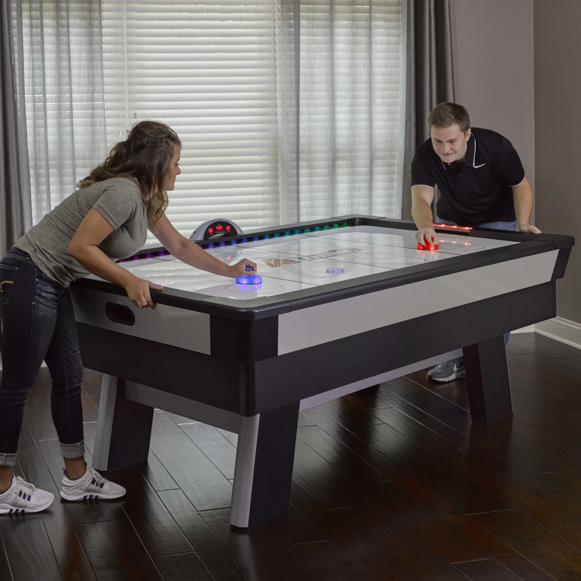 Enjoy the action-packed fun of the arcade in your own home with the Atomic Top Shelf Air Hockey Table. This classic arcade-style air hockey table features a 120V motor for maximum air flow creating consistent puck action. The slick 82" L x 41" W play surface is constructed out of PVC laminated MDF for high-speed play. Play in the dark as the LED Lumen-X technology illuminates the table with red, green, and blue multicolor light effects while listening to high-tempo music for added intensity. These interactive lights change colors during gameplay when each player scores a goal, taking the competition to another level. The fast moving game play with the LED puck and LED pushers is a game changing air hockey experience you don't want to miss! Four large legs create a stable, sturdy playing surface for premium performance. The Atomic Top Shelf Air Hockey Table includes LED accessories for exciting play in the dark! The table includes one red and one blue LED pusher and one red hexagonal LED "spinner" puck that provides challenging, unpredictable rebounds for advanced play and one red and one blue round puck for traditional game play. Try them all for hours of fun with family and friends.