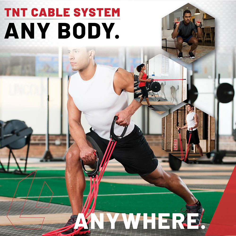 Without damaging doors or moldings, add variety to your resistance training with the TNT Cable System featuring a movable plastic door anchor and self-centering cradle that allows you to work your full body in multiple planes and to use dynamic exercises like twists, punches and chops to build balanced muscles and increased flexibility. The ergonomically designed handles allow for quick and easy cable changing to vary resistance levels depending on fitness levels and the muscle targeted for continued strength, endurance and performance gains. Includes one Instructional download or DVD.