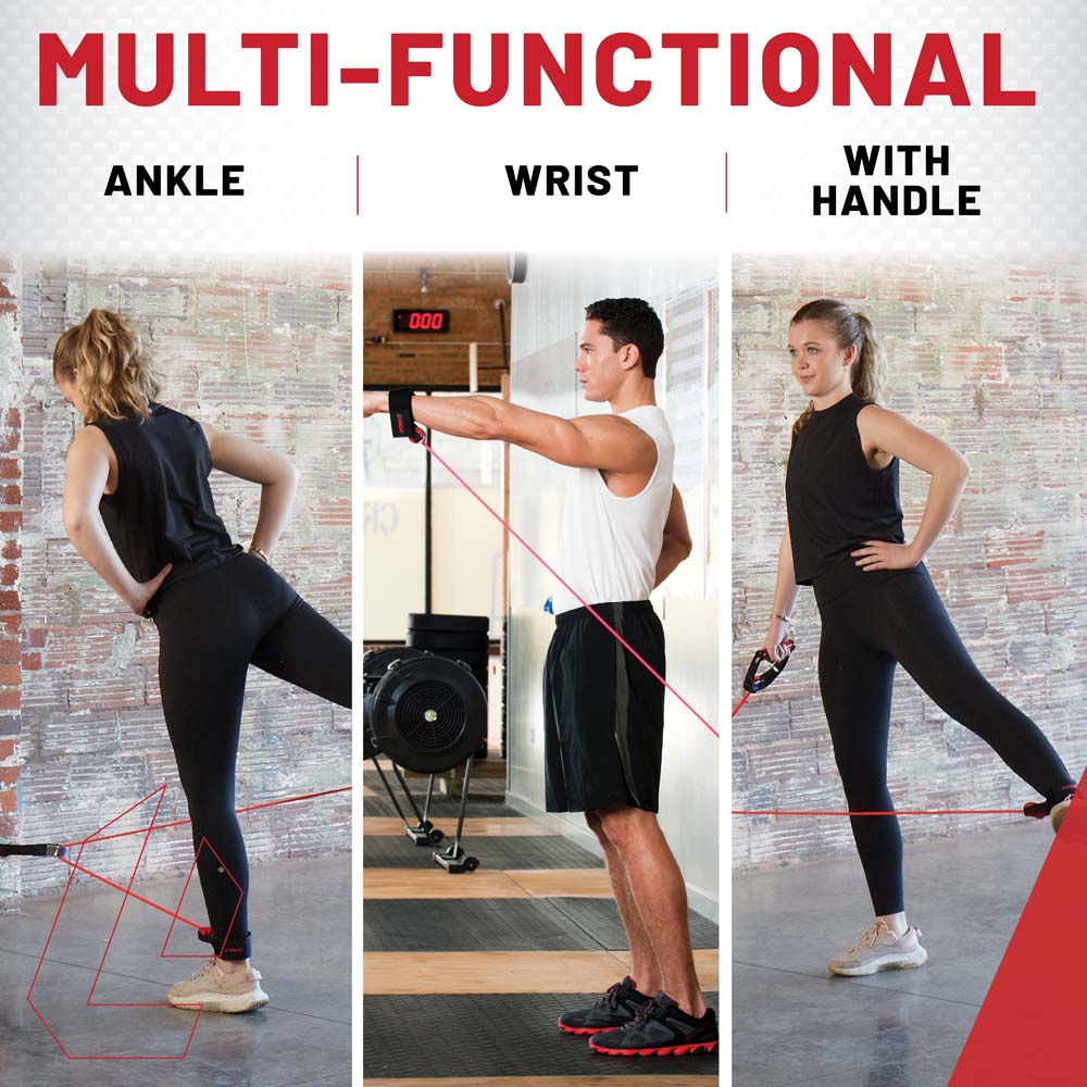 The Lifeline Ankle/Wrist Attachment is an interchangeable resistance cables accessory designed to use in connection with your Lifeline Resistance Cables for isolating hard-to-train areas of the body. The Ankle/Wrist Attachments incorporate Lifeline’s patented, easy to use, interchangeable process to add/subtract resistance cables which allow the user to increase/decrease peak resistance from 10lb to 100lb. Attach to either your ankle or wrist and connect a Lifeline Resistance Cable to isolate and target muscles all over the body: upper body, core and lower body. Attach to your wrist as an alternative to one of our handles to take stress off your hand/finger joints while performing upper body or core strengthening exercises. Attach to your ankle to increase lower body strength or train for explosive movements. Often used in connection with some of the other Lifeline resistance items such as the Train Station Doorway Gym, Lifeline Door Anchor or any of the Variable Resistance Kits. The Ankle/Wrist Attachments are adjustable in size for a safe and secure fit and they are padded for comfort. Made using heavy duty nylon material in the construction to meet the demands of gyms, studios or a home.