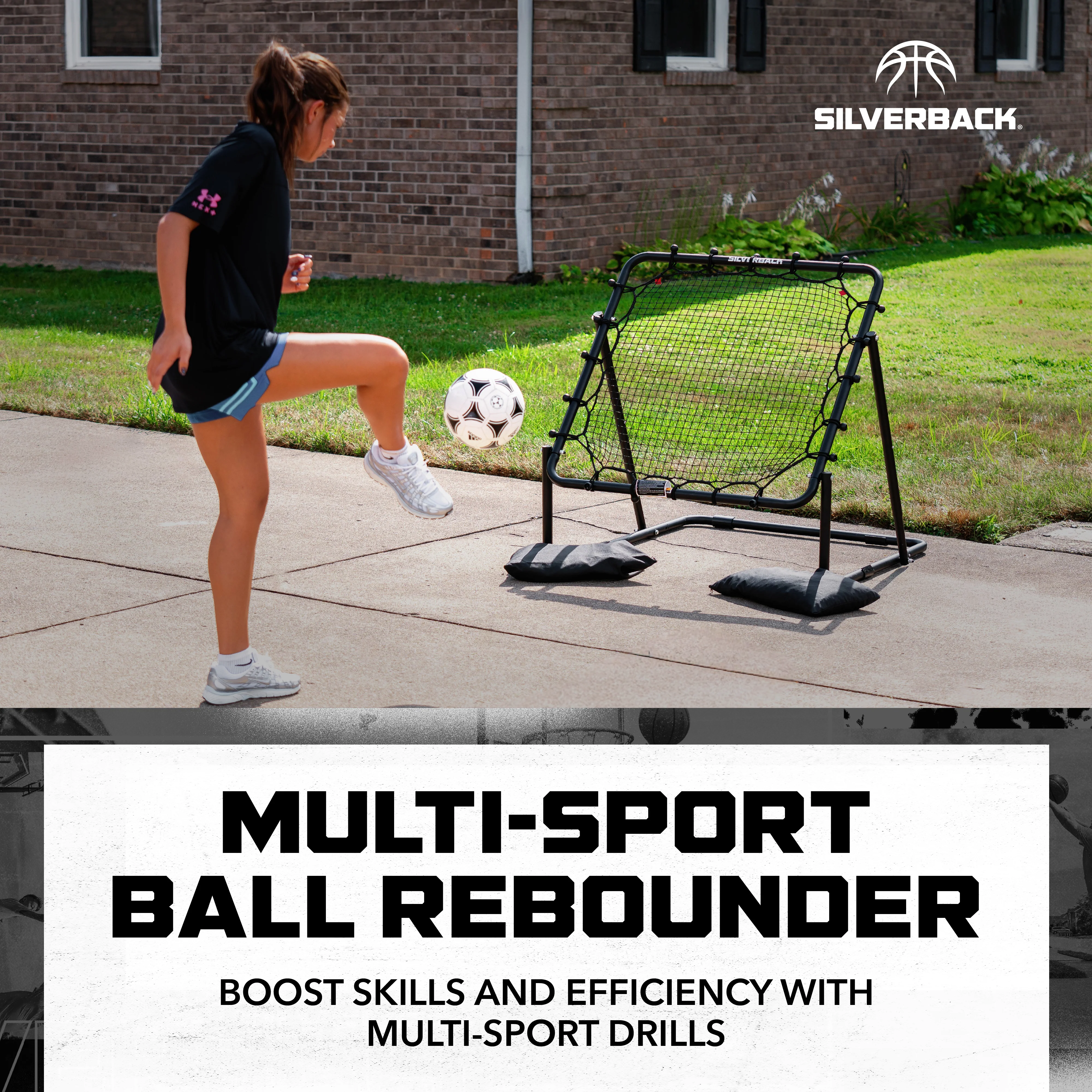 The Silverback Multi-Sport Ball Rebounder Net is perfect for improving skills like fielding ground balls or stimulating pop flies with a baseball or softball, along with strengthening lacrosse shooting, passing, and catching skills. Work the net by passing the basketball to yourself, catching the quick return, and stepping into game-speed shots to sharpen your passing, footwork, and scoring touch. Offering even more efficiency, practice using soccer balls, footballs, and volleyballs too. It can easily be moved from any location at any time for practice anywhere, anytime, and can be stored in most compact spaces when not in use. The rebounding net is great for solo athletes looking to practice their individual skills and can be set up anywhere or against portable basketball hoops. The rebounder's sturdy construction allows for competitive use for years. Dimensions: Tallest height: 46.5”, Length: 45.5”, Width: 39” and can be adjusted to angles of 50, 65, and 80 degrees; it is compatible with Silverback NXT54 and NXT50 Portable Basketball Hoops. Take your game to the next level with Silverback!
