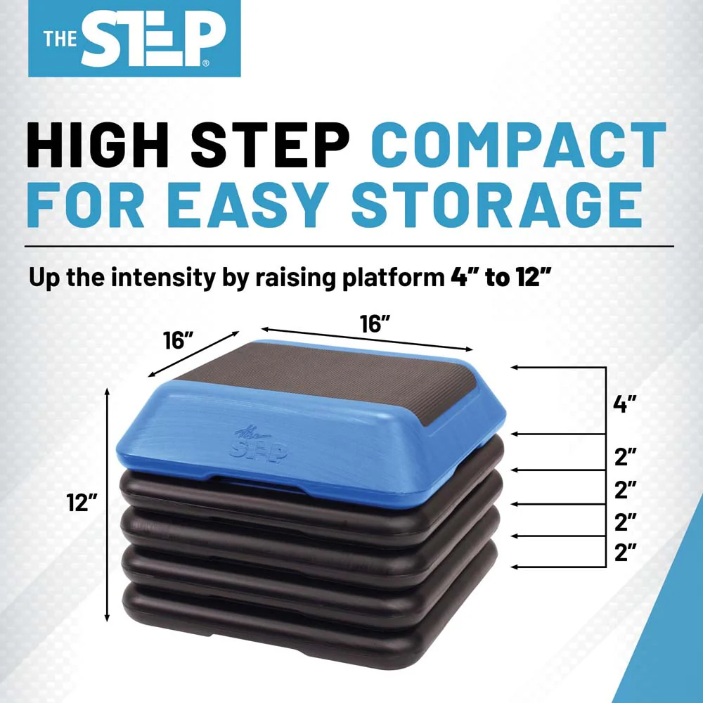Get more from your workout while minimizing space with The Step High Step. The Step is a great home-fitness tool for beginners to experts and is customizable for a variety of aerobic and strength exercises. This system includes a blue High Step platform and 4 original risers to create the foundation of any workout program. The platform features one (1) 13" x 9" stepping surface and four (4) risers (16" L x 16" W x 2" H). These sturdy risers can be used on any type of indoor flooring from carpet to concrete without leaving behind scratches. Burn more calories the higher you step with 4" to 6" to 8" to 10" to 12" platform height options using the included risers. Each High Step and riser are made with four nonskid feet to prevent sliding or moving during exercise. The risers and platform also feature a resistance band notch, which safely holds the band in place. Made in the United States, this set is crafted from durable, recyclable high-density polyethylene that supports up to 275 pounds (or up to 400 lbs. with risers). This product is backed by a 90-day manufacturer's warranty period