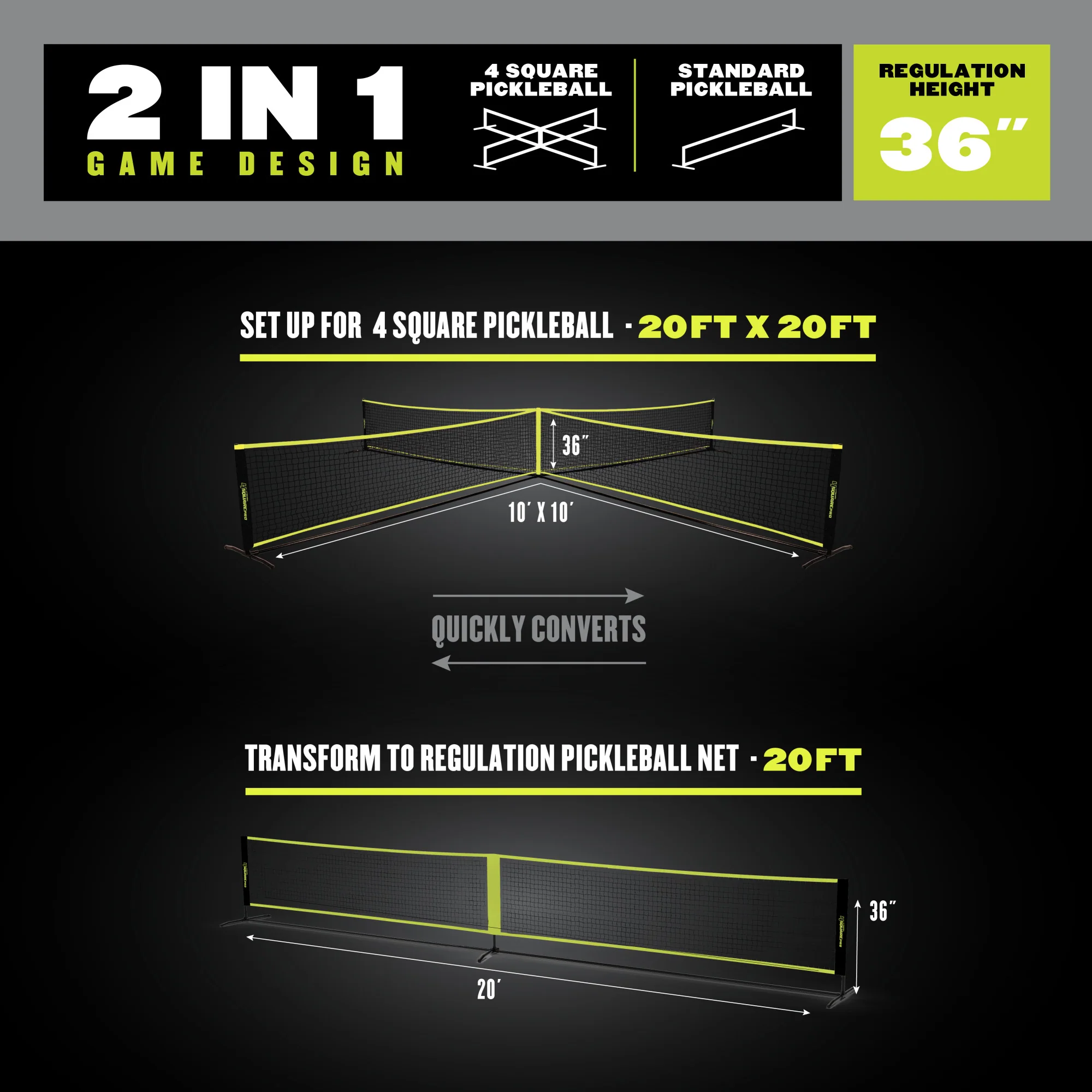 Upgrade your outdoor game setup with the 4-Square Pickleball Pro—an all-in-one pickleball and four square set built for competitive, high-energy play. Featuring Pro-level enhancements like higher density paddles, a tear-resistant net, stronger nylon components, and a regulation 36" net height, this versatile set is perfect for everything from family lawn games to intense driveway tournaments. The 20-foot-wide net easily converts between game modes, while the durable metal frame and tool-free assembly make it ideal for hard surfaces like blacktops, gym floors, and driveways. Whether you're hosting a backyard game night, leading PE class, or practicing pickleball fundamentals, the 4-Square Pro delivers fast setup, portable convenience, and long-lasting fun for all ages.