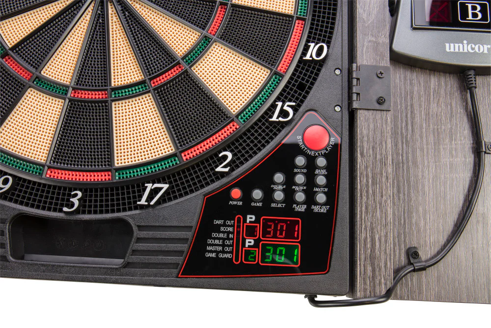 The dartboard cabinet is equipped with cabinet doors featuring a backlit cricket display, ensuring easy readability during gameplay. It offers a range of features including virtual opponent gameplay, double in/out options, handicap, and miss dart features, enhancing the gaming experience for players of all levels. With 28 games and 271 game variations available, accommodating from 1 to 16 players, there's no shortage of entertainment options. In-game sound effects, including voice and sound effects, further immerse players in the action. The wooden cabinet, complete with brass-coated hinges, not only provides durability but also adds a stylish accent to any room where it's displayed.